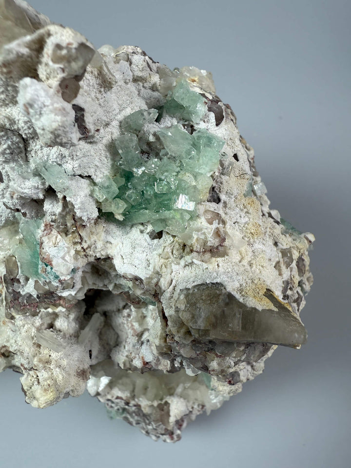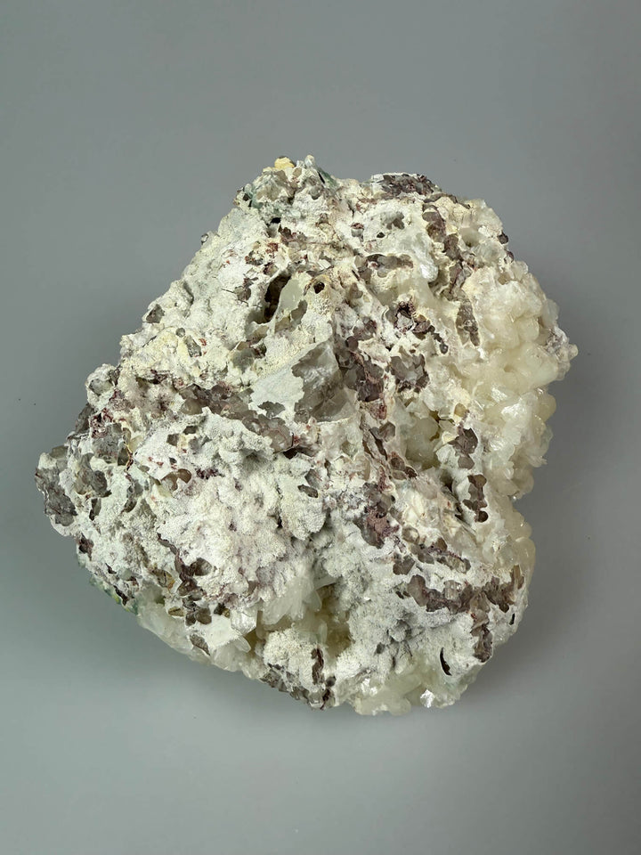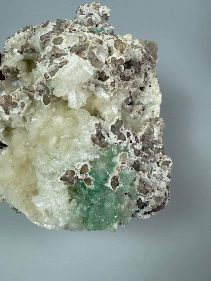 Deze bijzondere apofyliet is echt een opvallend stuk. De vorm en structuur doen sterk denken aan koraal, waardoor het lijkt alsof het zo uit de zee komt. De witte kristallen, de bruine accenten en de frisse, lichtgroene apofylietpunten vormen samen een prachtig natuurlijk geheel dat direct de aandacht trekt.