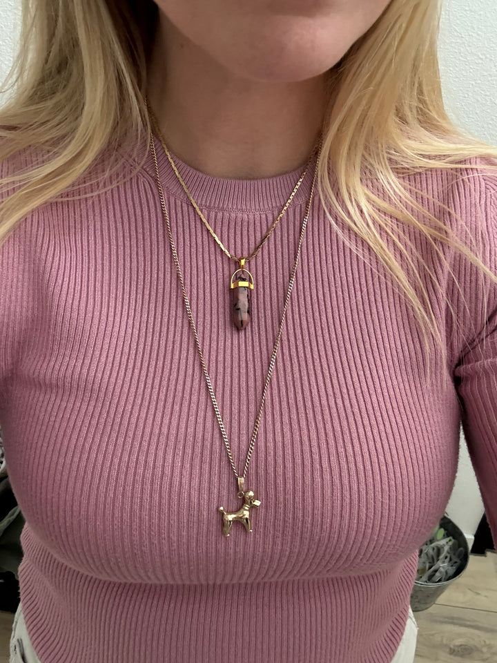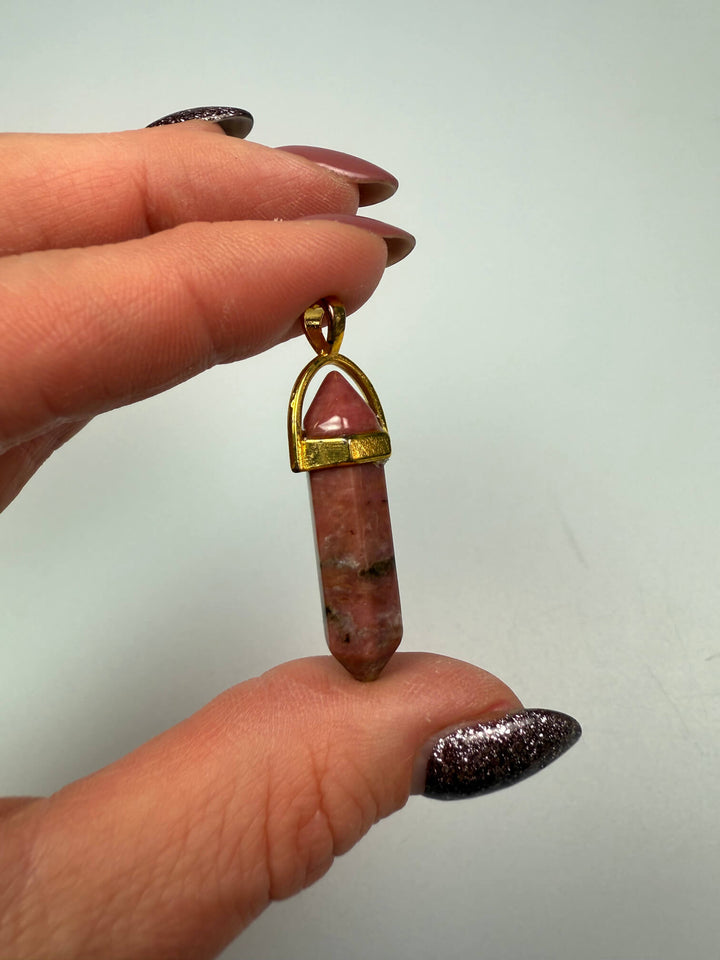 Rhodoniet dubbeleinder hanger: een liefdevolle en harmoniserende edelsteenhanger met twee punten, die emotionele heling ondersteunt en rust en zelfvertrouwen bevordert.