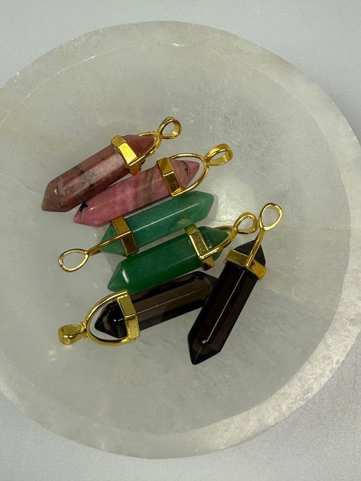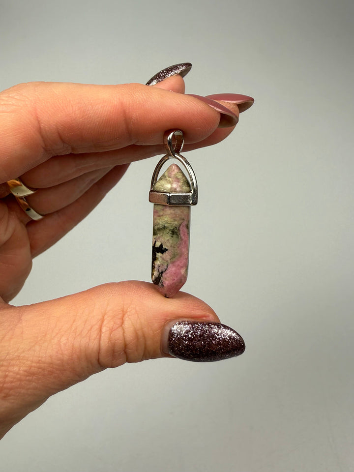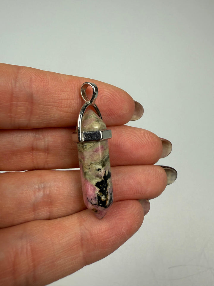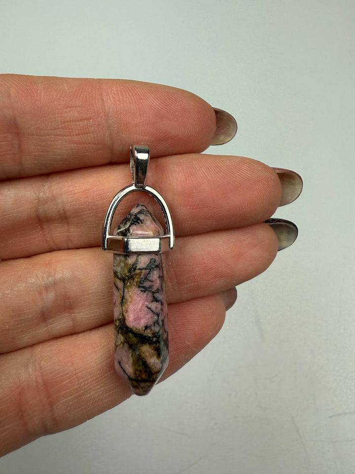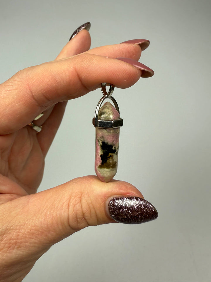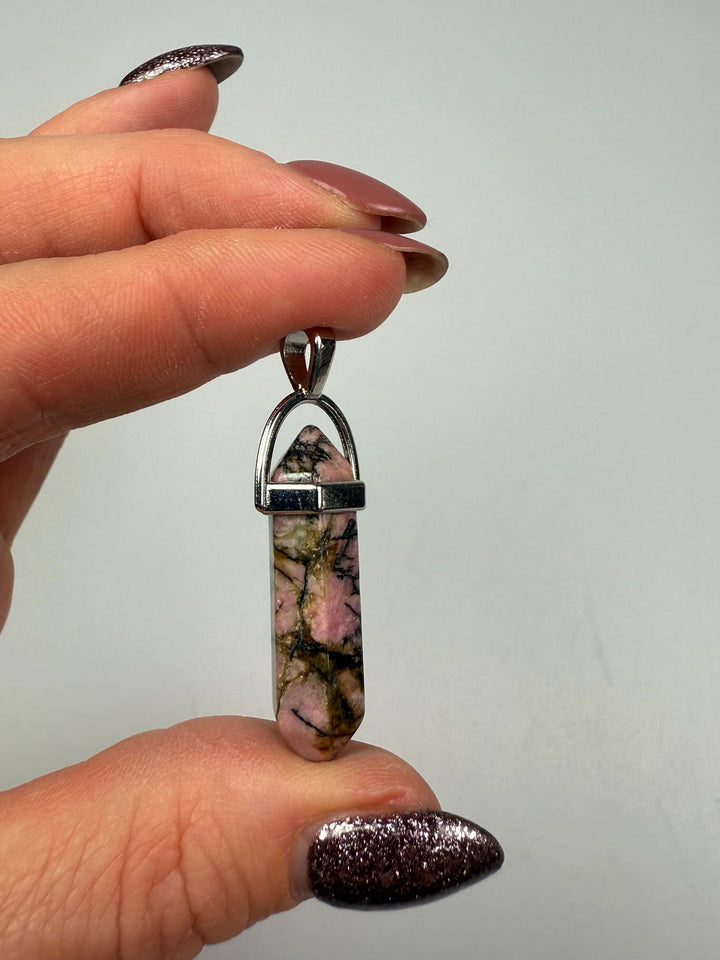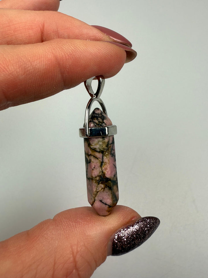 Rhodoniet dubbeleinder hanger: een liefdevolle en harmoniserende edelsteenhanger met twee punten, die emotionele heling ondersteunt en rust en zelfvertrouwen bevordert.