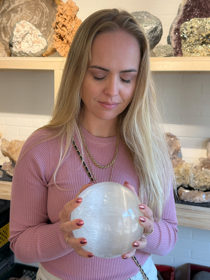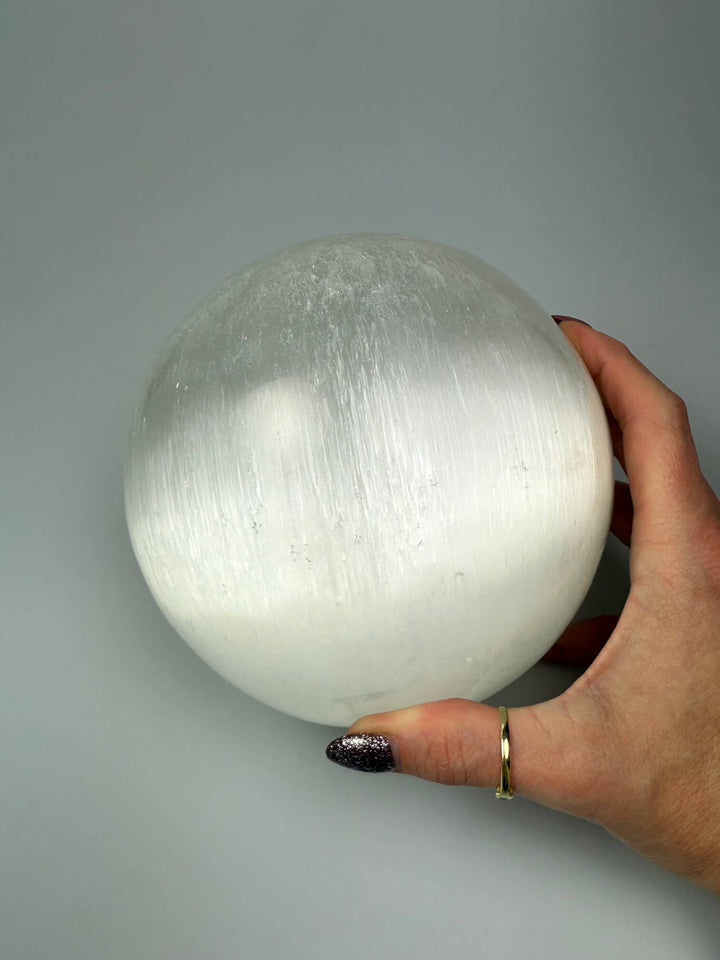 Deze prachtige seleniet bol brengt licht en zuiverheid samen in één uniek decoratiestuk dat sfeer, schoonheid en energetische kracht combineert.