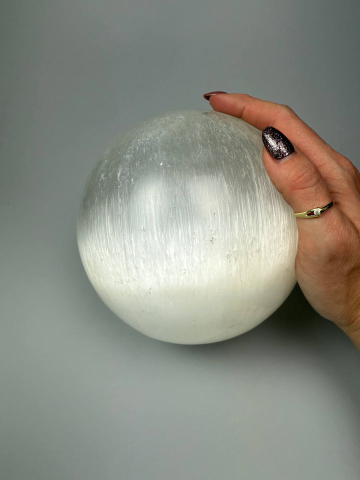 Deze XXL Seleniet bol is een indrukwekkend en stijlvol stuk dat direct rust en helderheid uitstraalt. De bol is vervaardigd uit hoogwaardige, natuurlijke seleniet en heeft een prachtige, zijdeachtige glans die het licht op een zachte en sfeervolle manier weerspiegelt. Dankzij het royale formaat is dit een echte eyecatcher die perfect tot zijn recht komt in de woonkamer, slaapkamer, praktijkruimte of meditatiehoek.